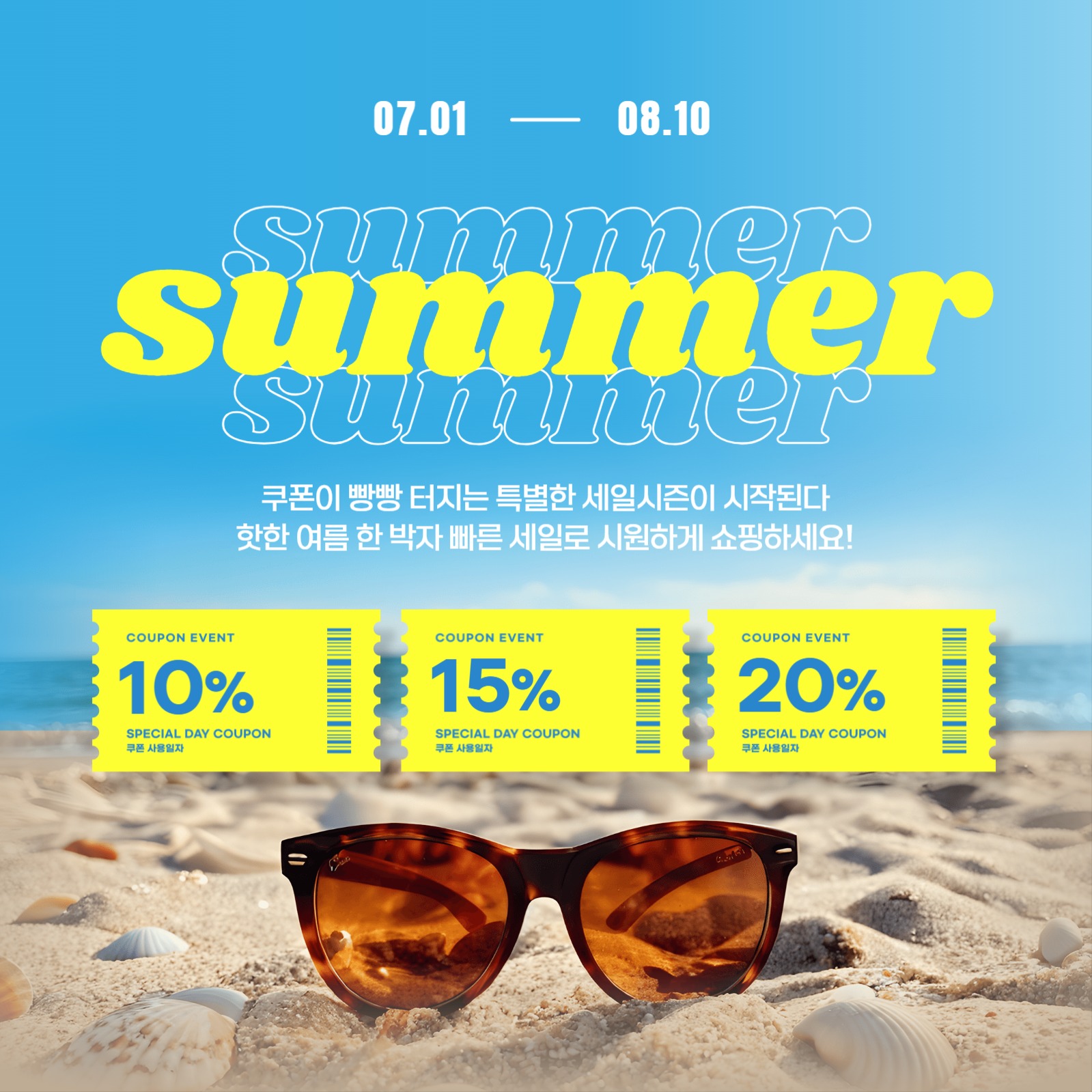 노랑과 파랑의 귀여운 여름 할인 광고