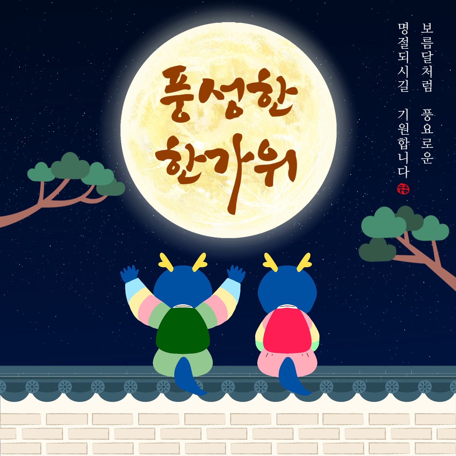 밤배경에 기와벽, 보름달 한가위 인사