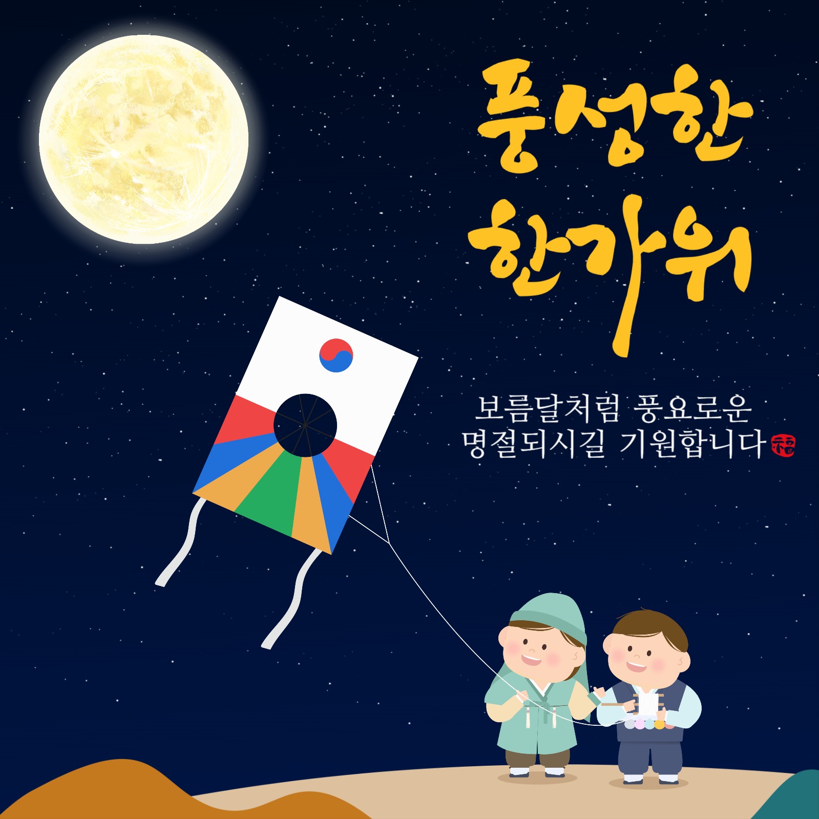 밤배경에 보름달 어린이 한가위 인사